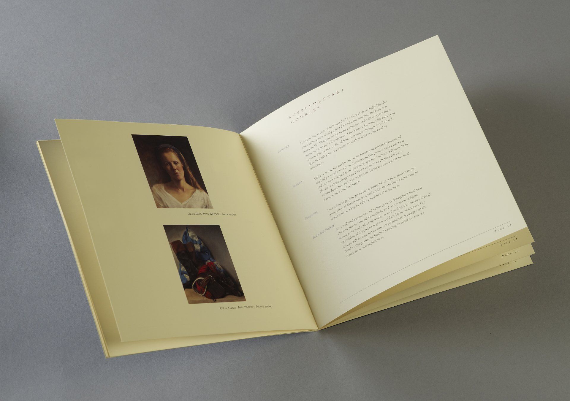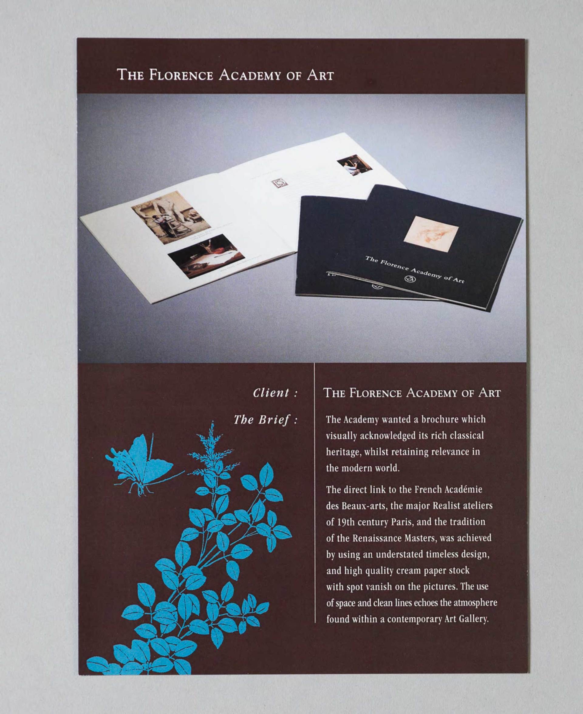 The Academy wanted a brochure which visually acknowledged its rich cultural heritage, whilst retaining relevance in the modern world. The existence of a direct historical connection to the French Académie des Beaux-arts, the major Realist Ateliers of 19th century Paris and the tradition of the Renaissance Masters, was achieved by using an understated timeless design along with high quality cream paper stock. Spot varnish was also added to the pictures in order to add and extra depth and richness to the pictures. The use of space and clean lines echoes the contemplative atmosphere found within a contemporary Art Gallery.