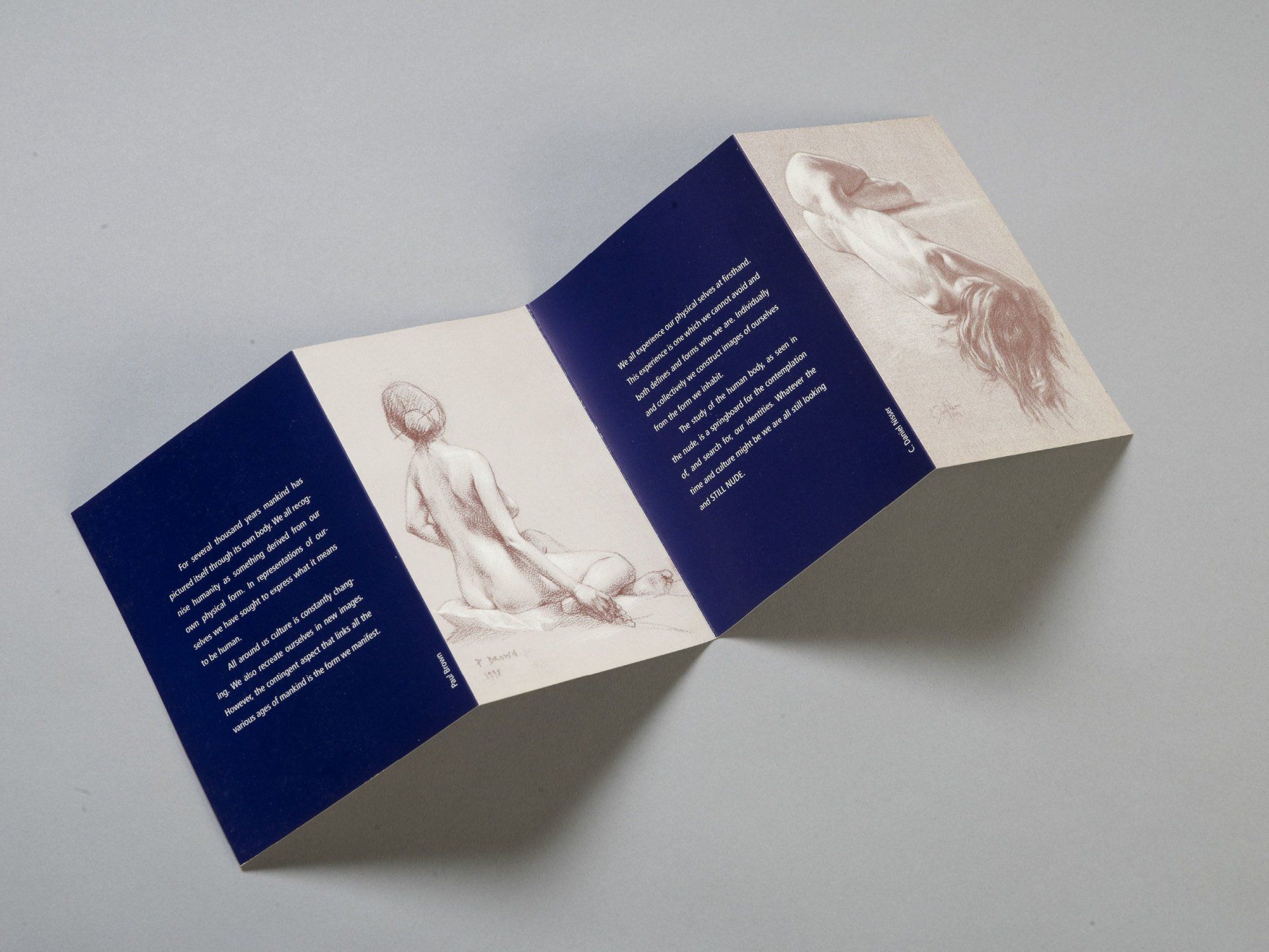 Daniel and Paul wanted a clean, modern invitation to invite guests to a shared Drawing exhibition they were holding in a nearby Art Gallery. They wanted to show one example of their work each, along with the Exhibition details and a description of themselves as artists and their work. The use of a simple accordion fold on good quality card was chosen as a way to reflect and balance both artists whichever way it was viewed. A rich and modern blue colour was chosen in order to compliment the subtlety of their beautifully drawn pencil and charcoal figures.